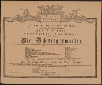 Erste Aufführung im Burgtheater am Michaelerplatz in seiner Funktion als Nationaltheater Theaterzettel, 8. April 1776 -