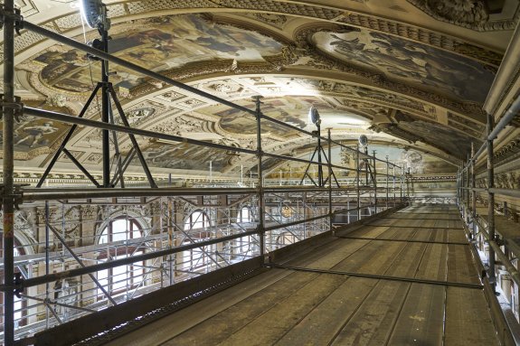 Der Rundgang beinhaltet die Besichtigung der frisch renovierten Deckengemälde über der Feststiege auf der Volksgartenseite von der Feststiege aus, die Besichtigung der originalen „Klimt-Kartons“ – Entwurfszeichnungen im Angelika Prokopp Foyer sowie die Besichtigung der Deckengemälde über der Feststiege Landtmannseite am Gerüst.